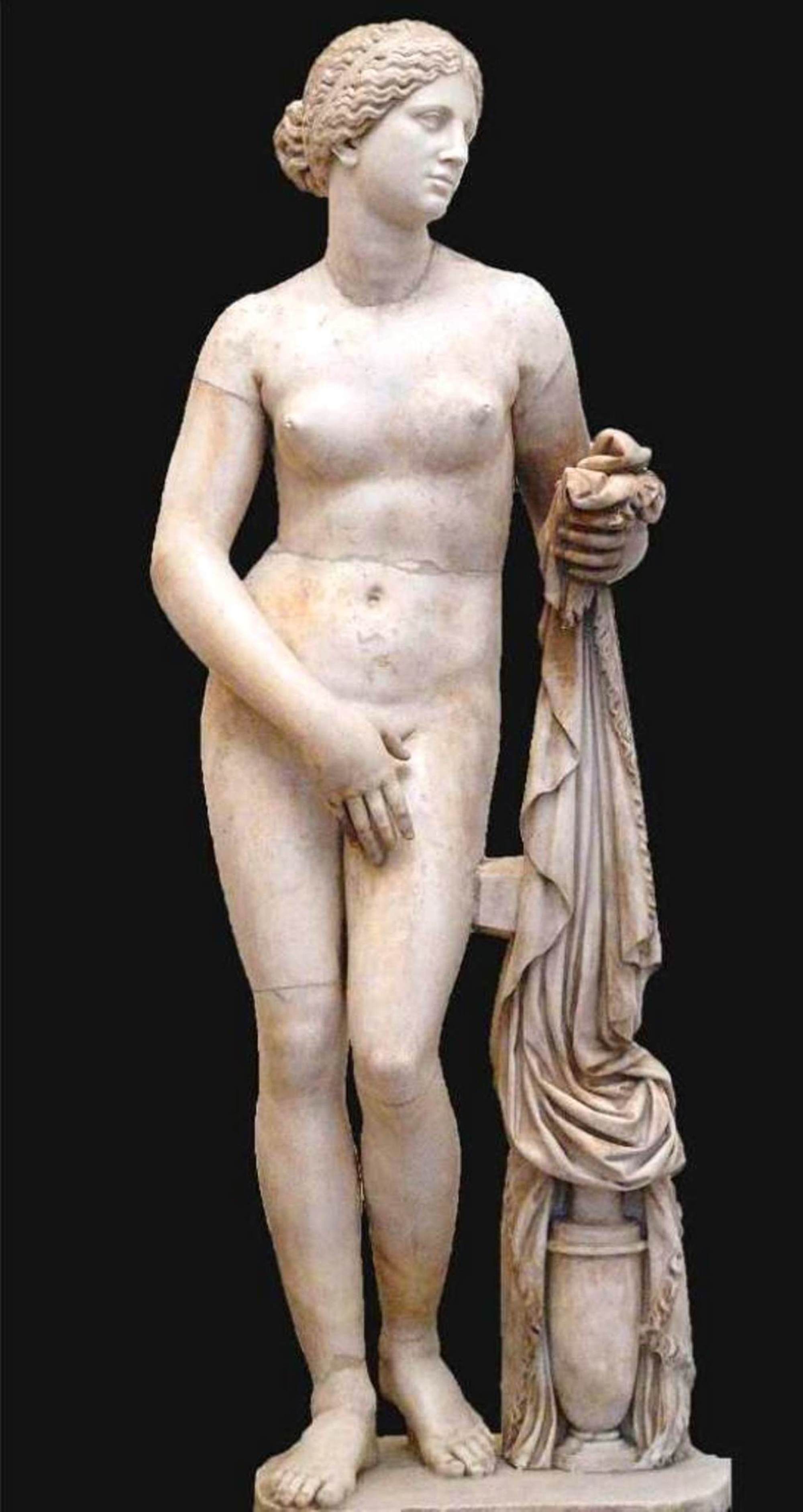 hubiese sido posible, Los mismos escultores griegos del s. IV a.C. habían puesto también objeciones a que Praxíteles hubiera utilizado a una hetaira (prostituta y filósofa, de los puestos helénicos) llamada Friné como modelo para su Afrodita. A lo que Praxíteles había contestado que Afrodita era la diosa del amor carnal, que nada tenía de extraño el haber aprovechado el atractivo erótico de una mujer, y que por otro lado cumplía uno de los requisitos griegos de la belleza: el ser semejante a los dioses, “ya que el mejor regalo que los dioses podían conceder a un hombre no era la inmortalidad, si no la belleza”[8]. El tratamiento de la figura en cuanto al material siguió la técnica de marcar una transición entre la parte superior de la figura (el cabello) y el resto del cuerpo[9]. De esta manera: -se